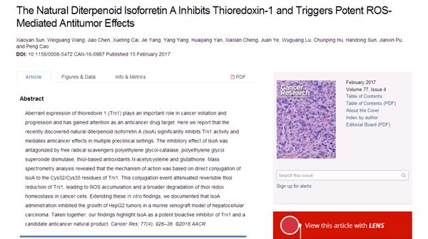 Recently, a team led by Prof. Cao Peng from the Third Clinical Medicine School, Jiangsu Integrated Chinese and Western Medicine Hospital, Nanjing University of Chinese Medicine have discovered the natural product Isoforrestin A, and its function in antitumor effects. The results have been published in Cancer Research.